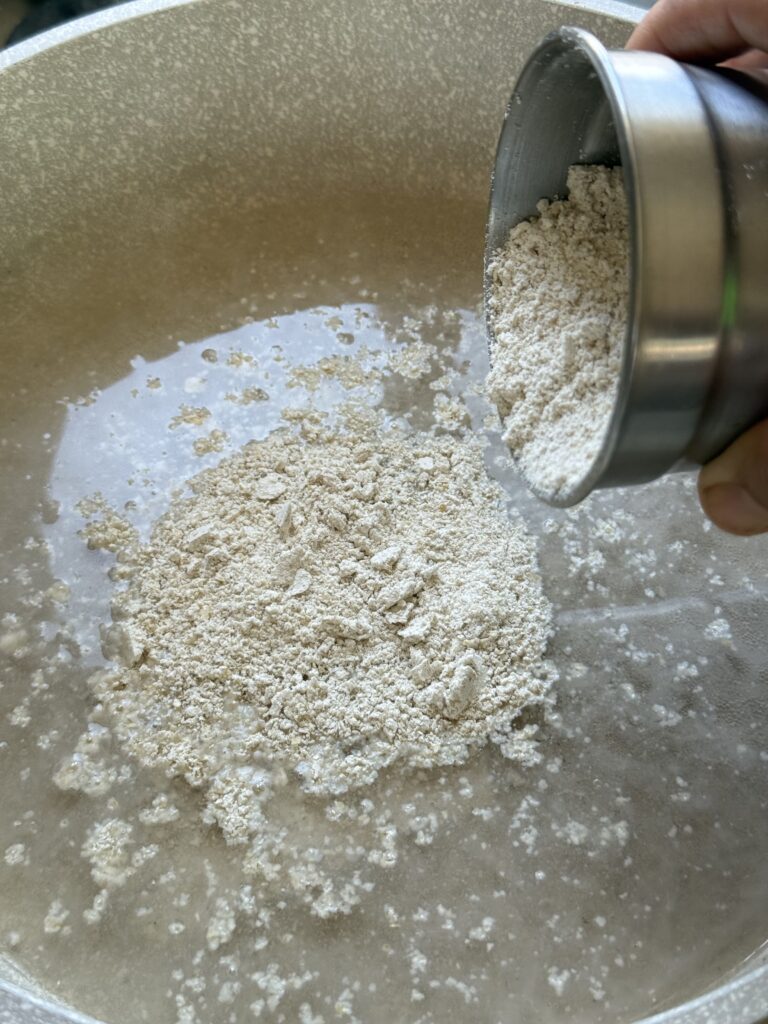 2. מוסיפים את קמח שיבולת השועל וכף שמן זית,מנמיכים את האש ומתחילים לערבב בכף עץ
