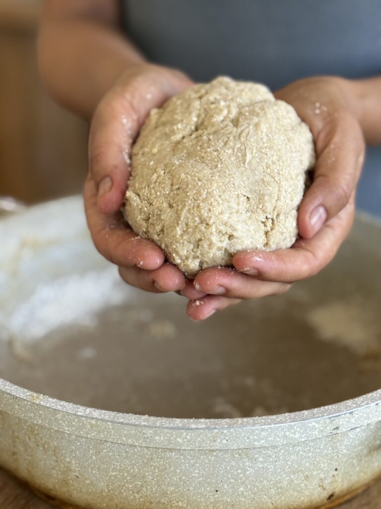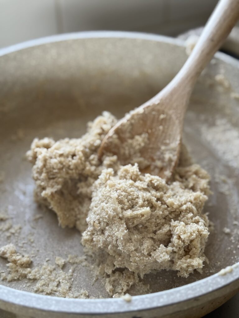 3. אם תוך כדי ערבוב של מספר דקות הבצק לא מתגבש, מוסיפים עוד מעט קמח שיבולת שועל