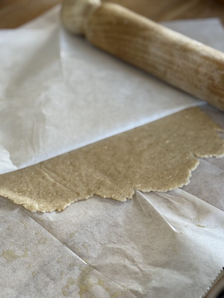 6. משמנים קלות נייר אפייה ומניחים את כדור הבצק בינהם. מרדדים בעזרת מערוך לעיגול בגודל פיתה – שימי לב לא דק מדי (שלא ידבק לנייר) ולא עבה מדי- ממש כמו בתמונות.