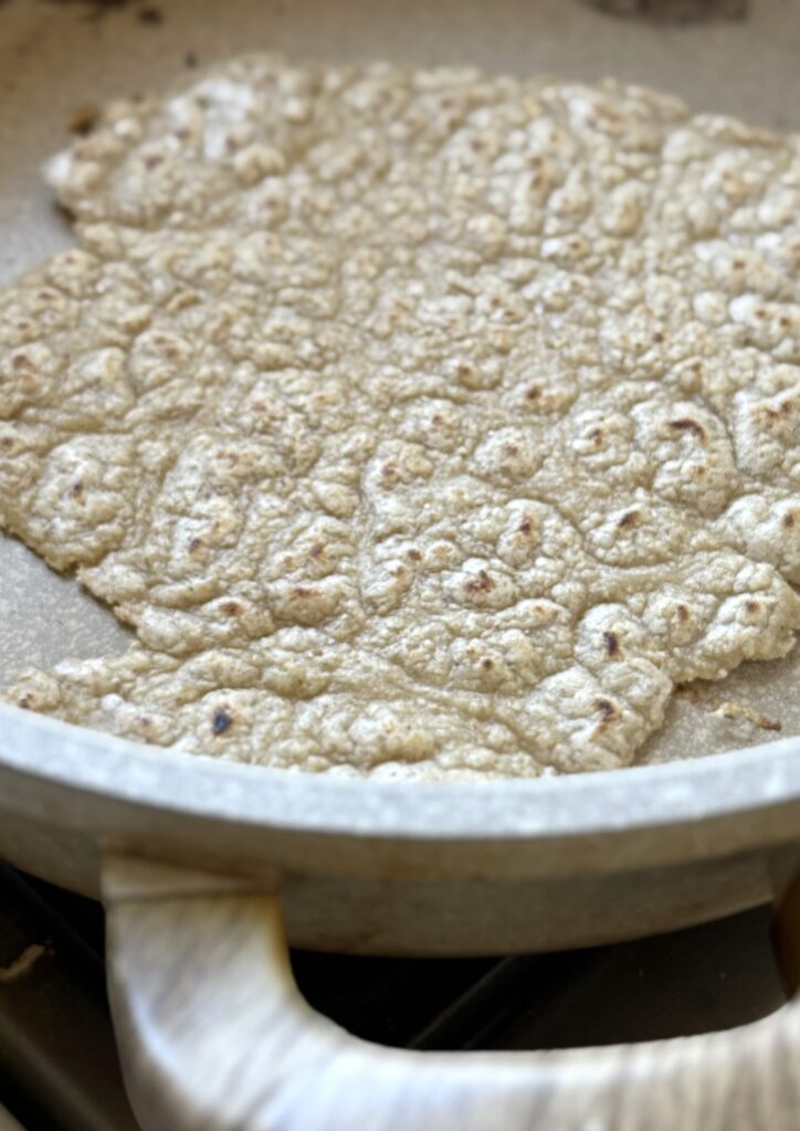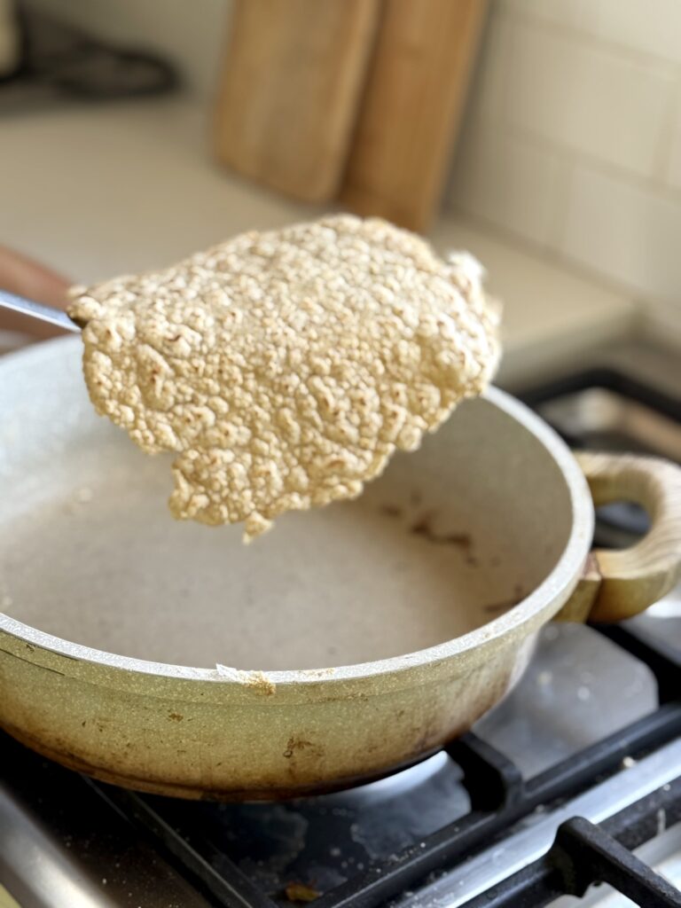 7. מחממים מחבת נונסטיק על אש בינונית וצורבים את הטורטייה משני הצדדים עד להזהבה.